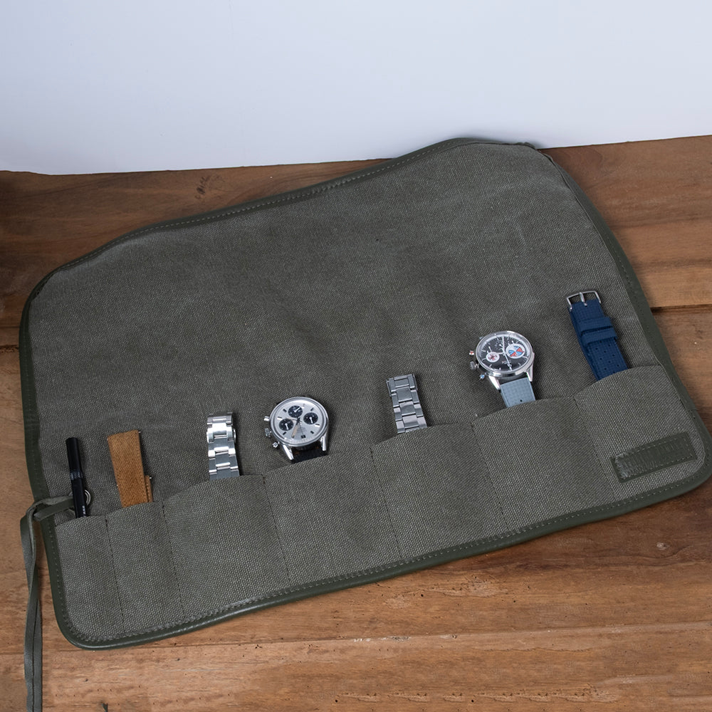 This 5-watch pouch is made from canvas woven in France. We've edged the canvas with leather, and we use the same leather for the drawstring.